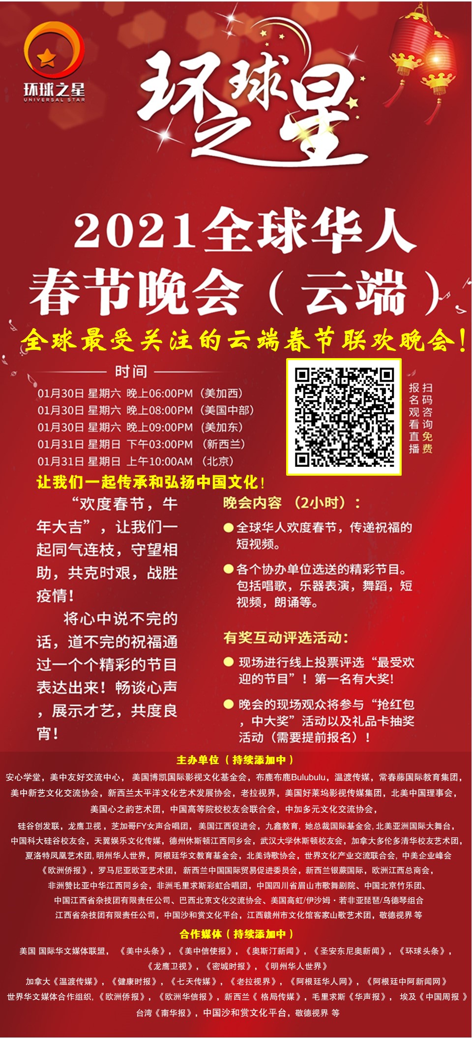 美国/加拿大 西部时间:2021年1月30日晚上6点 一,活动主题:“环球之星” 2021全球华人春节晚会(云端) “欢度春节,牛年大吉”,全球华人共同迎接美好的未来! 让我们一起传承和弘扬中国文化!一起守望相助,共克时艰,战胜疫情!